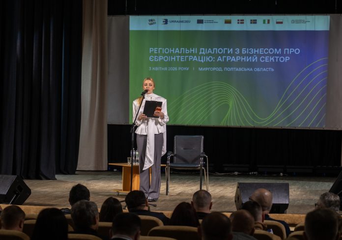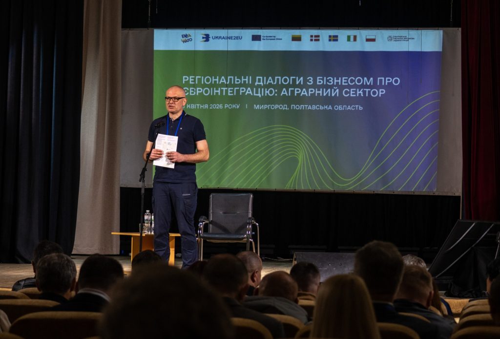 3 квітня 2026 року в місті Миргороді відбувся другий захід серії регіональних діалогів між Урядом та бізнесом, ініційованих Віцепремʼєр-міністром з питань європейської та євроатлантичної інтеграції України. У центрі обговорення – практичні аспекти адаптації до стандартів ЄС в аграрному секторі. Захід обʼєднав близько 100 представників підприємств з Полтавської, Сумської, Чернігівської та Черкаської областей.